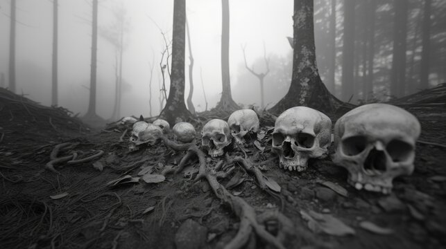 Eerie sight of skulls scattered in a dense, foggy forest with large tree trunks