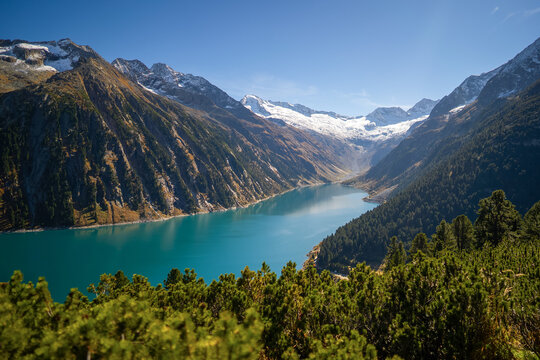 The bow shaped turquoise Schlegeisspeicher lake with the glacier in Tyrol