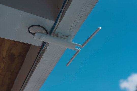 Close-up of an outdoor AP mesh unit with two antennas mounted on the balcony ceiling of a building, Connectivity and technology concepts