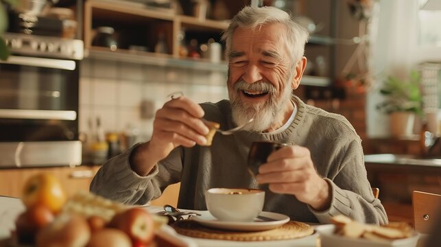 Senior man and happy with portrait at breakfast in dining room for nutrition healthy meal and retirement Elderly person and smile in home with porridge relax and morning routine in apa : Generative AI