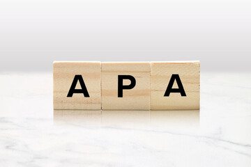 the acronym apa for american psychological association word or concept represented by wooden letter tiles on a wooden table with glasses and a book