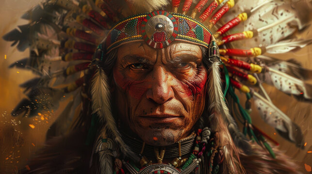 Headshot of a group Serious Native American men wearing their traditional outfits looking away