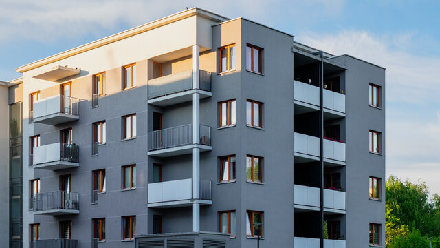 Modern luxury residential flat. Modern apartment building on a sunny day. White apartment building with a blue sky. Facade of a modern apartment building.