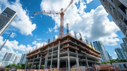 Fragment of modern glass facade of the building under construction against background of sky with clouds. Office or residential building at sunset. Copy space.