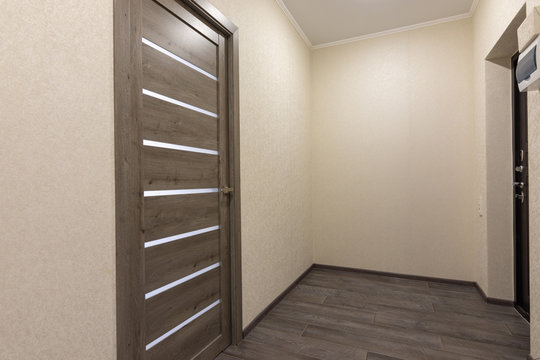 Outdoor sunny exterior front view, typical facade of modern residence or apartment in city of Europe with rectangular windows and earth tone wall.