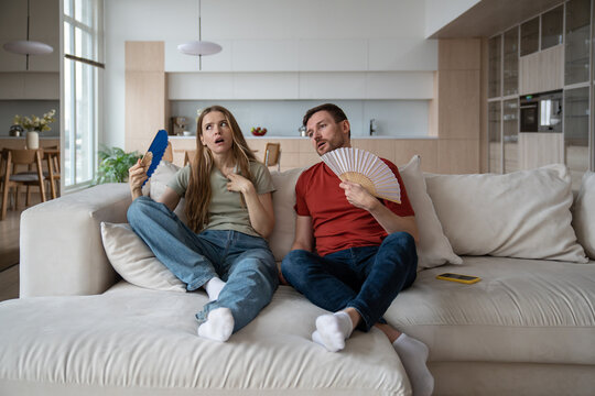 Couple suffering from hot sultry sweltering summertime weather at home. Sweaty exhausted wife and husband waving with hand fans sitting on sofa in overheated house in need of ventilator, conditioner