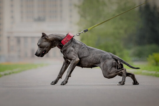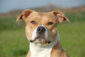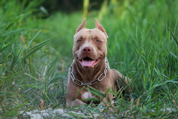 Cute american pit bull terrier puppy is standing on a green grass in the summer park. Pet animals.