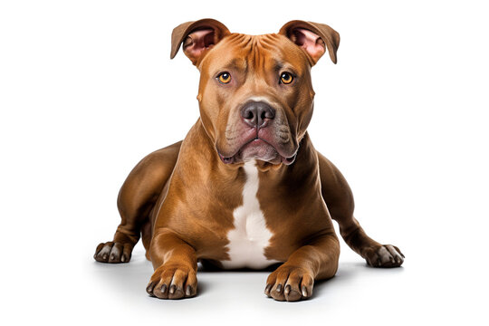 A Beautiful adult purebred American Pit Bull Terrier dog lying down on white background looking forward into camera