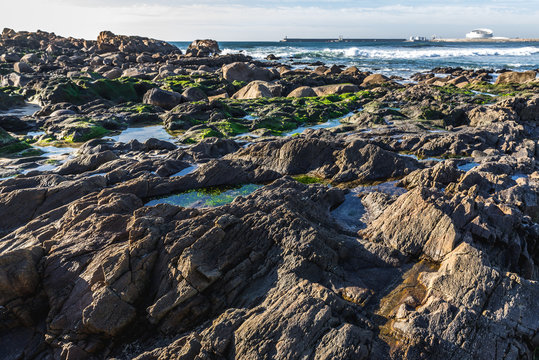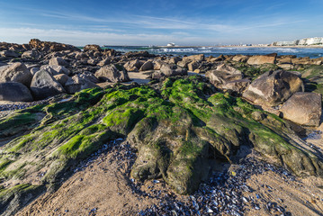 Atlantic Ocean rocky beach in Porto city, Portugal