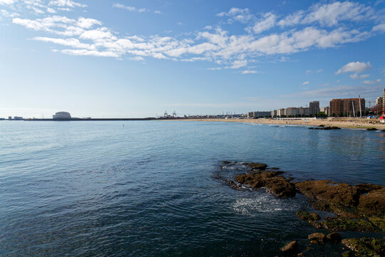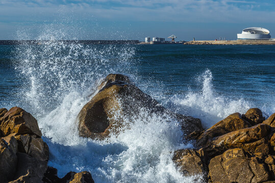 Port of Leixoes breakwater, view from Atlantic Ocean beach in Matosinhos, Portugal
