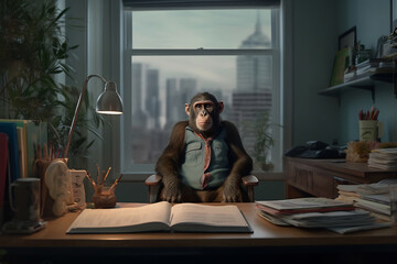 A monkey dressed like a businessman and sitting at the table