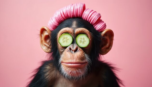 Chimpanzee with pink hair rollers and cucumber slices on eyes. Monkey is undergoing a funny beauty treatment. It looks like it is in a spa or salon having facial care.