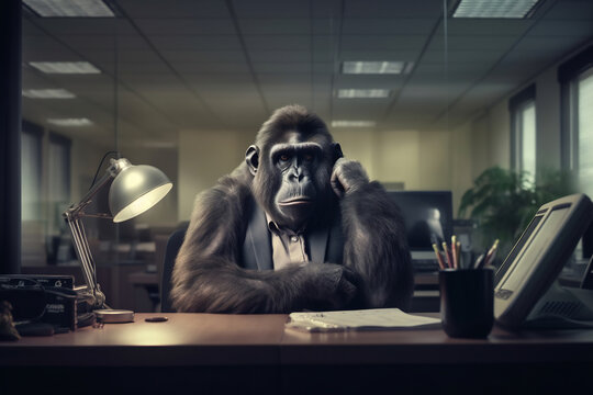 Young chimpanzee sits at a desk with a laptop and a white mug, mimicking human behavior