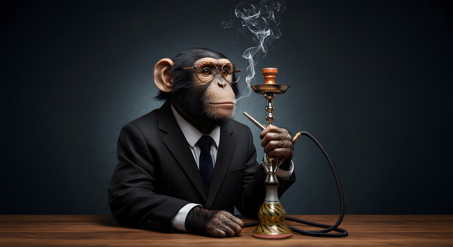 ape wearing tuxedo suit holds out a champagne glass isolated on dark green background