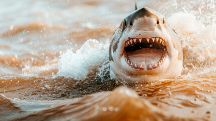 A close-up of a great white shark emerging from the water with wide jaws and sharp teeth, creating a powerful and dramatic scene.