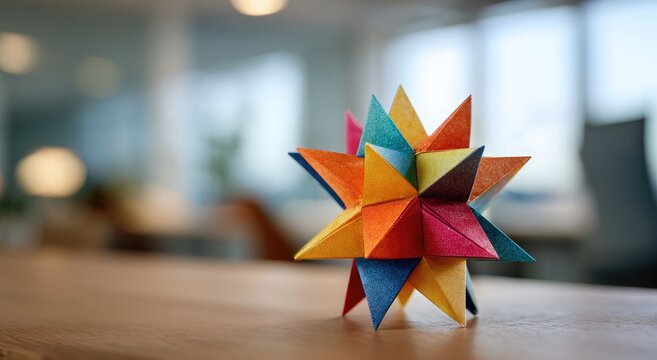 A brightly colored geometric star sculpture sits atop a wooden table in an office setting