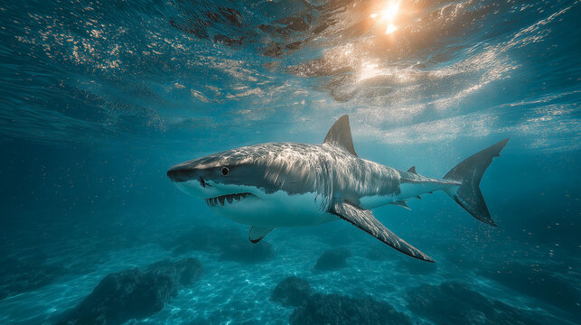 Majestic great white shark glides through sunlit ocean depths