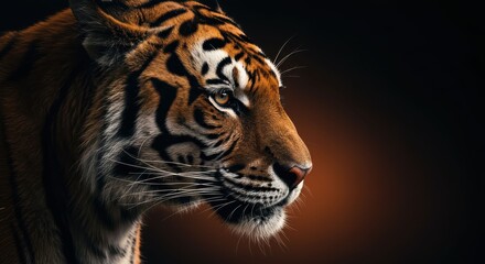 Close-Up Portrait of a Bengal Tiger in Warm Dramatic Lighting on Dark Background