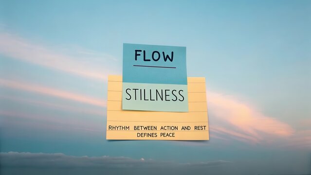 Two parallel unbroken notes displaying 'FLOW' and 'STILLNESS' above a quote about peace against a soft atmospheric sky gradient