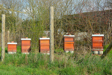 Five wooden bee hives stand in the apiary behind a wire fence on the grass. Sunny spring day. Bee breeding and conservation concept.