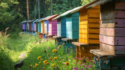 A row of brightly colored beehives stand in a forest clearing, bathed in the warm glow of sunlight. The hives are painted in a variety of hues, creating a cheerful and colorful scene