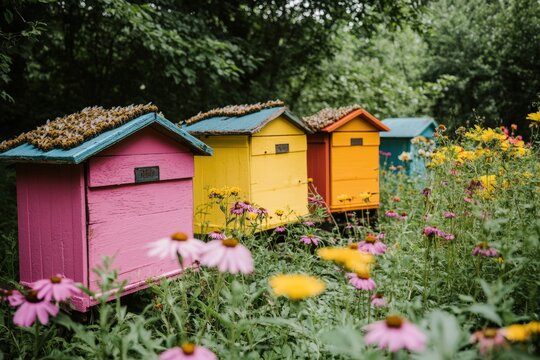 Colorful hives stand proudly among vibrant wildflowers in a serene garden setting during the warm sunlight of summer. Generative AI
