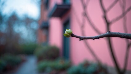 Close-up of a spring apical chestnut bud opening against a blurred background featuring a pink residential building wall and an abstract pattern of tree branches.