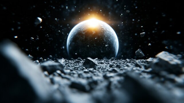 Floating debris and broken satellite in orbit around dark planet post apocalyptic space atmosphere