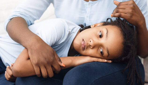 Family Support. Black woman comforting her offended kid who lying her head on mother's lap