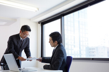 上司に頭を下げながら書類を渡す男性