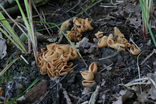 Group of rare peziza vesiculosa mushrooms, a species of apothecial fungi from the family Pezizaceae. They are native almost only to Europe. The pale, cup-shaped ascocarps can grow up to 10cm.