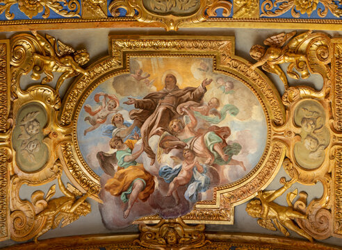 GENOVA, ITALY - MARCH 6, 2023: The fresco apotheosis of St. Anthony  of Paua in church Basilica della Santissima Annunziata del Vastato probably by  Giulio Benso from 18. cent..