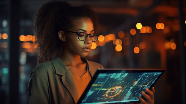 Black woman with tablet. innovation, research and programming in future information technology.. Developer for startup business website software