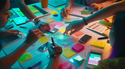 Team designing innovative app interface at colorful workspace