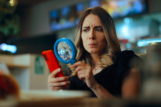 Woman Using Magnifier Spying online on social media. Suspicious girlfriend checking online profile of her boyfriend
