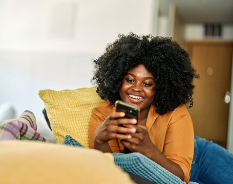 Caucasian woman browsing smartphone at home in relaxed setting