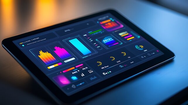A tablet device showing a gaming app with colorful graphics, a scoreboard, and action buttons on the screen