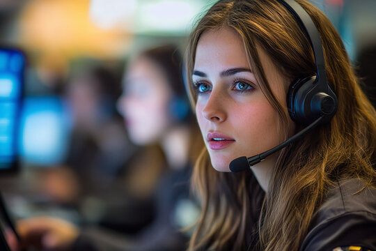Smiling woman wear headset, engaged in positive, interactive conversation call, agent, answering, app, assistant, call center, business