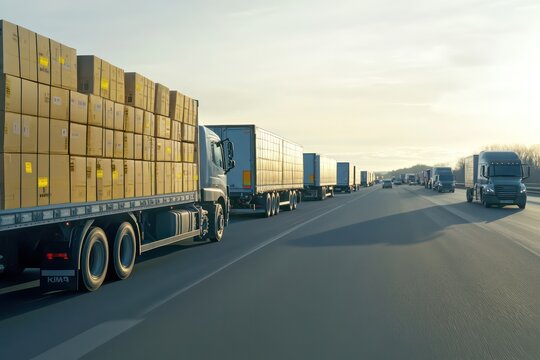 A fleet of delivery trucks loaded with packages heading out on delivery routes, with an app on a smartphone tracking the logistics and delivery progress.