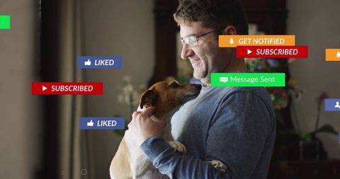 Mature man cuddling small dog at home with social media notifications and cozy interior