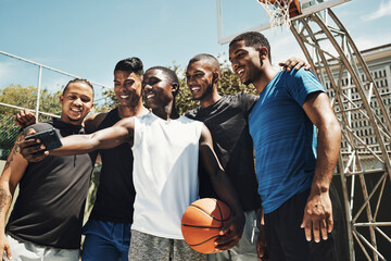 Selfie, basketball and team on a sports court for partnership, collaboration and training together with a phone. Happy, young and athlete group with a photo on smartphone while doing fitness exercise