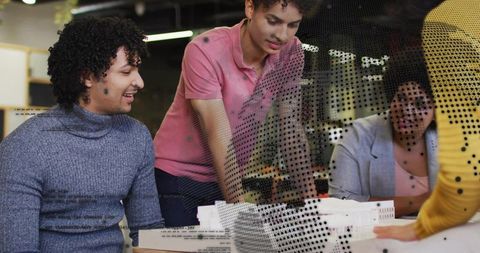 Innovative diverse team brainstorming on design prototypes in bright modern office