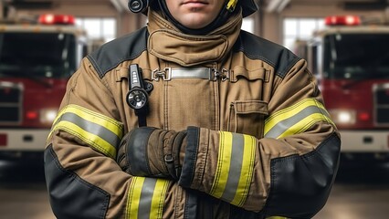Two smiling firefighters in yellow helmets and tan jackets share a moment of laughter outdoors near fire trucks. They wear breathing apparatus packs. Their strong bond and teamwork is evident.