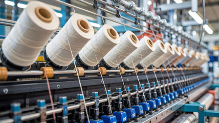 A close up of weaving machine. A loom machine for clothing or woven label. Weaving machine for garment industry. Yarn thread lines on the weaving loom machine for clothing  in textile factory.