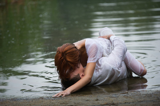 couple making love on the shore. Clothes are wet and the woman is laying on top of the man.