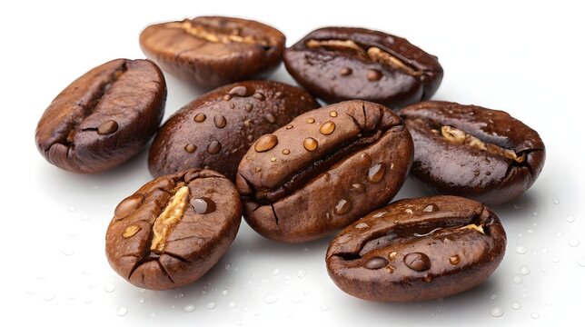 Close-up view of coffee beans, scattered and slightly overlapping. Individual beans showcase varied textures, with visible cracks and crevices. Water droplets are apparent on the bean surfaces,