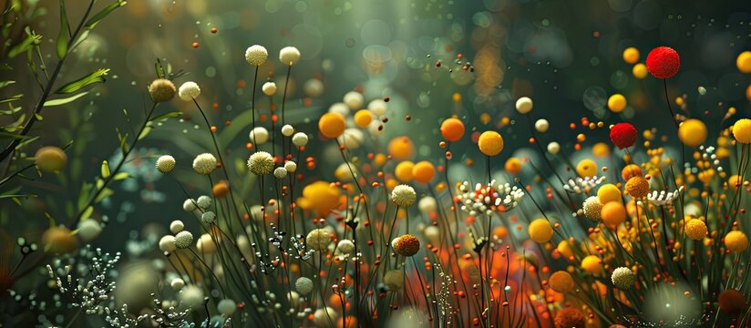Uploaded is an image displaying a cluster of blooming plants with yellow orange red and white spherical seed heads The foliage seems to be green and elongated providing a colorful copy space image