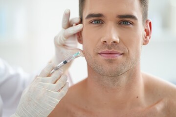 Man receiving facial treatment with a syringe for aesthetic enhancement