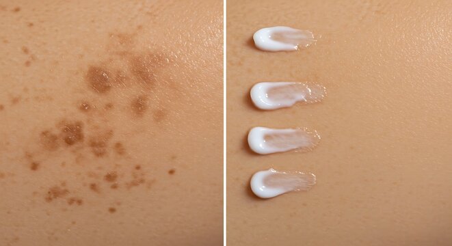Skin with dark spots and pigmentation contrasted with cosmetic cream, illustrating dermatological solutions for blemish reduction and skin enhancement