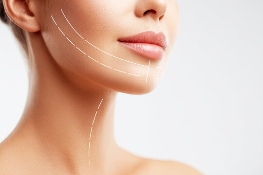 A close-up of a woman's face highlighting beauty and cosmetic enhancement techniques with subtle markings for aesthetic procedures.